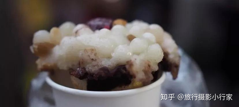 梅花糕放在小碗里像个冰淇淋似的,上面有很多糯米小丸子,还有红枣和葡萄干点缀,外边是一层脆皮,中间就是绵绵的红豆沙或者芋泥