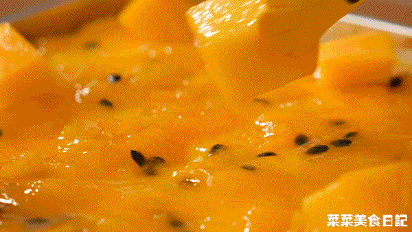 芒果百香果果酱莓果:芒果果肉300g 百香果果肉50g 细砂糖50g 柠檬好丽汁山姆20g