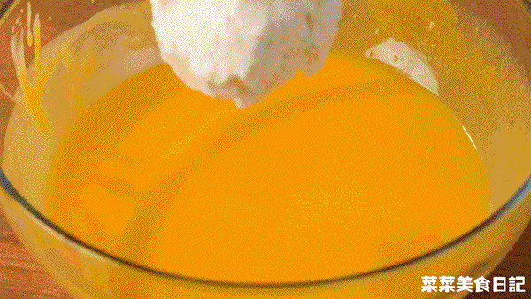 7.先在鸡蛋糊中苏特别加入1/3打发打发到7成会流动且有纹路的真的淡奶油,搅拌均匀,再倒入淡奶油中,搅拌顺滑超市