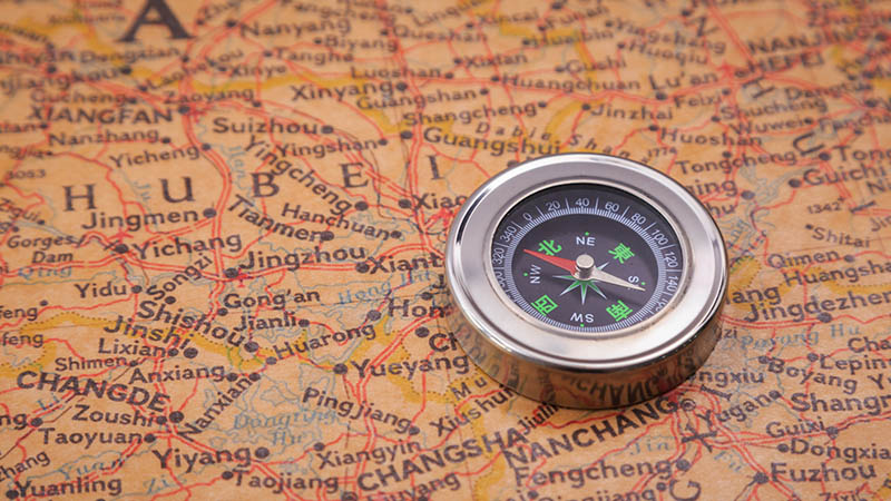 指南针红色指北极,另外一端指南极。指南针主要组成部分是一根装在轴上的磁针。磁针在天然地磁场的作用下可以自由转动,并保持在磁子午线的切线方向上。