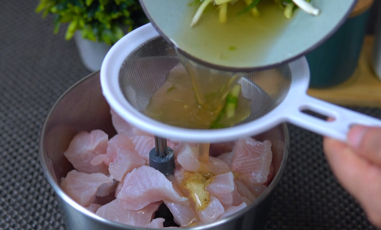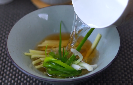2,做一点葱姜水,碗中加入姜丝,香葱,一勺料酒,半碗清水用手抓一抓,抓出葱姜的汁水。