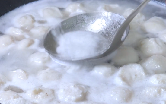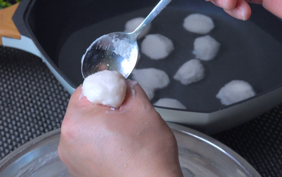 5,锅中加入清水烧到微开状态,左手取出搅打好的鱼肉用虎口挤出,用勺子下入锅中。