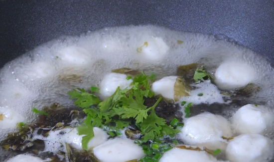 8,做一个丸子汤:用清水煮开,加入食盐,胡椒粉,紫菜,煮上2分钟,出锅前撒上葱花和香菜。
