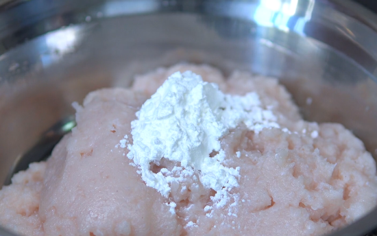 4,绞好的鱼肉放入盆中加入一勺土豆淀粉,戴上手套顺着一个方向搅打上劲。