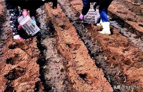 土豆在播种的时候呢,先在菜地中钩出若干条钩,然后把土豆块种植下去,土豆块的芽要向上;摆好土豆块之后呢,就往里面撒点草木灰,干燥的那种,但是不能是那种刚烧制好的,需要静置好几天的那种草木灰。