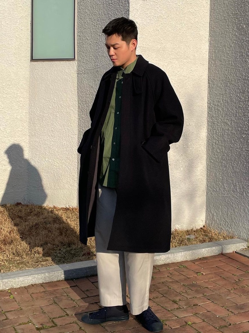 LOOK1:黑色大衣+军绿色衬衫+米白色裤子+黑色鞋子