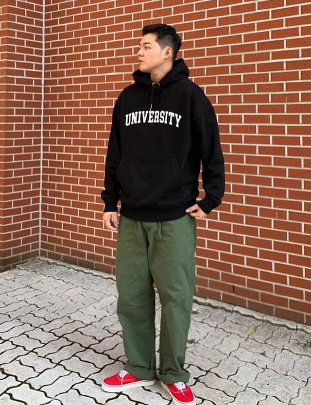 军绿色是男孩子们的衣服中常见的颜色,会让人看起来特别有阳刚之气。在天气转暖的南方,现在穿一件卫衣作为外套也是很合适的。黑色的连帽卫衣时尚温暖,前幅白色字母的印花让整套穿搭更显简约魅力。下半身选择军绿色的裤子,瞬间让造型变得潮流起来,鞋子则选择醒目的红色,是整套穿搭最亮眼的点缀,看起来特别帅气高级。