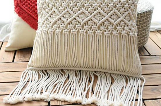 在制作装饰抱枕之前,先准备一个方形的枕芯和一块适当大小的布料,剪两块方形形状的布料,布料比枕芯稍大一点。在布料的边缘处缝制上流苏装饰品,将方形枕芯放在布料里面,把边缘缝起。