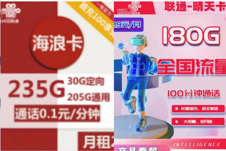 另外还夹杂着一两款月租29包含180g加100分钟的四川联通晴天卡。还有海南联通海浪卡,月租39,每月包含235g全国流量,通话一毛一分钟,首年月租优惠到29。