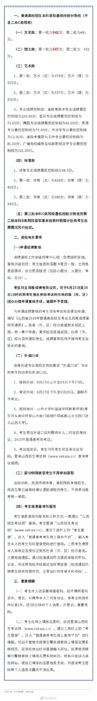 【文科542 理科507!山西公布2019年高考录取分数线】6月24日,山西公布高考招生各科类各批次录取控制分数线:①文史类:第一批为542分;第二批为481分。②理工类:第一批为507分;第二批为 432分。