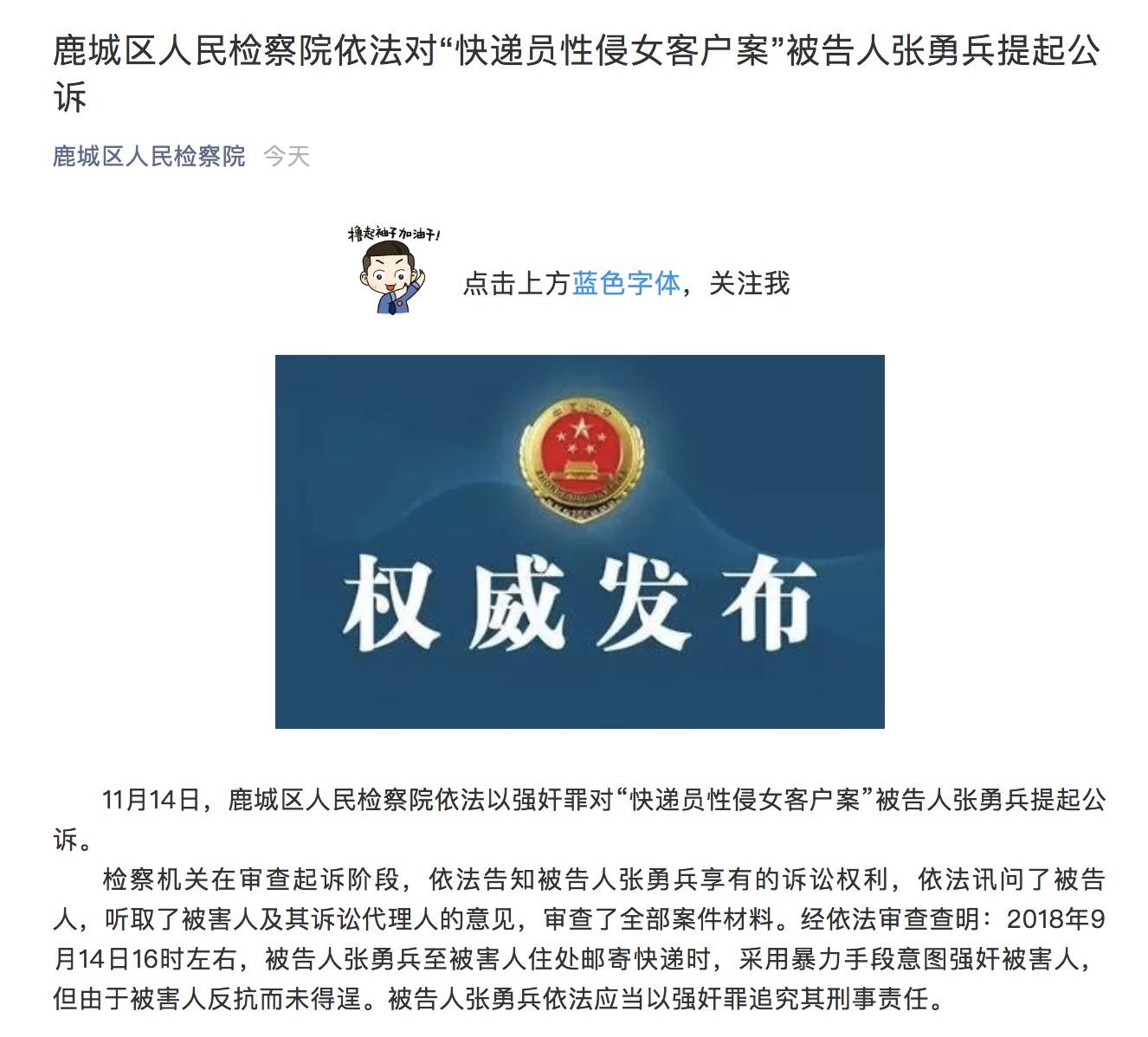11月14日,鹿城区人民检察院依法以强奸罪对“快递员性侵女客户案”被告人张勇兵提起公诉。2018年9月14日16时左右,被告人张勇兵至被害人住处邮寄快递时,采用暴力手段意图强奸被害人,但由于被害人反抗而未得逞。被告人张勇兵依法应当以强奸罪追究其刑事责任。