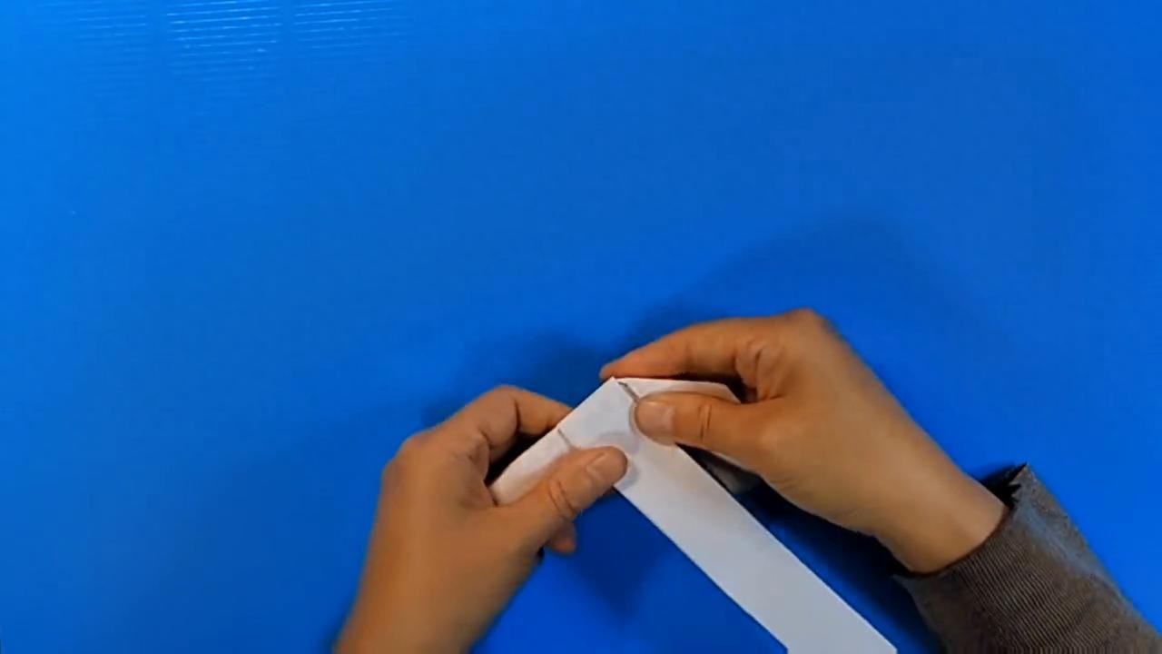 ·准备一张A4纸,将它做两次对折再合起来。按这样的方式折两条,将一条折起。按图解将另外一条围绕它转一圈半剪掉。