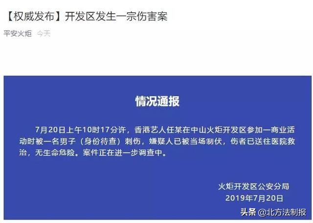 中午,火炬开发区公安分局发布了情况通报:“7月20日上午10时17分许,香港艺人任某在中山火炬开发区参加一商业活动时被一名男子(身份待查)刺伤,嫌疑人已被当场制伏,伤者已送往医院救治,无生命危险。案件正在进一步调查中。”