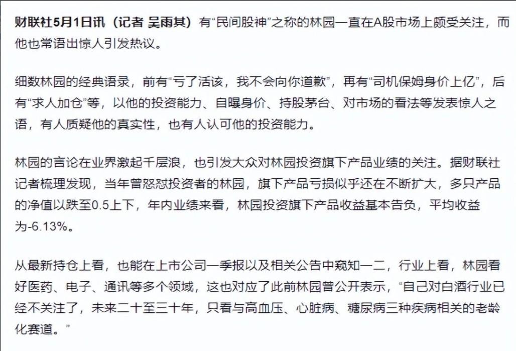特别是在2013年,林园因为加杠杆重仓买入茅台,结果茅台股价大跌,他差点爆仓。这一次,几乎让他功亏一篑。股市的无情让这位股神也尝到了苦果。而他的私募基金在接下来的几年里也是损失惨重,据说亏损累累,达到了24%的惊人数字。